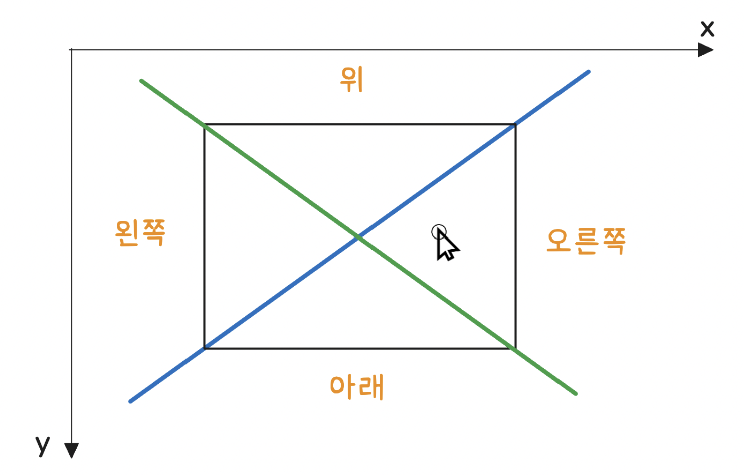 2. 드랍 할 위치에 있는 콘텐츠를 대각선 2개 그은 뒤 사분면 중 어느 곳에 둘지를 결정하는 함수를 작성한다.